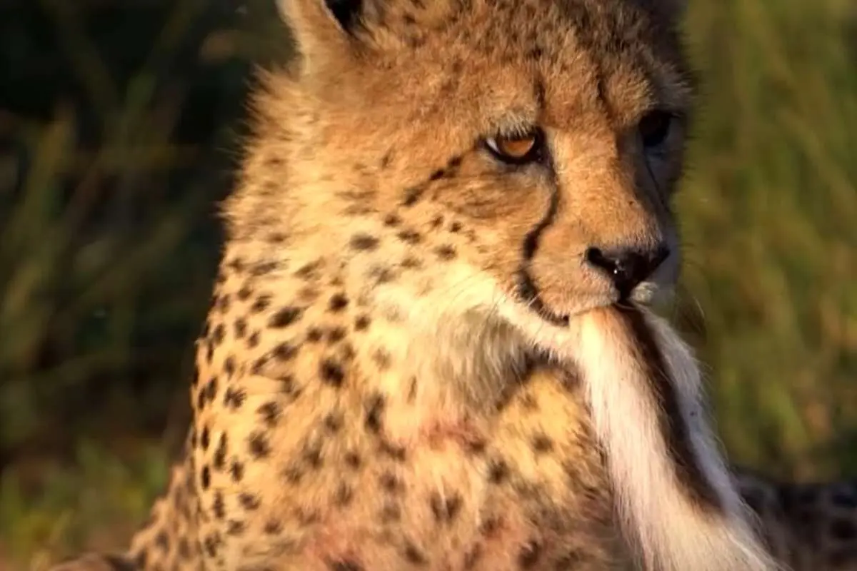 یک یوزپلنگ نر جوان، دم یک ایمپالای تازه شکارشده توسط مادرش را در دهان گرفته است. یوزهای جوان پس از پایان شکار، مدتی را در کنار لاشه سپری می‌کنند. آن‌ها با گرفتن و کشیدن بخش‌هایی از شکار، مهارت هماهنگی حرکتی و کنترل قدرت گاز گرفتن را تمرین می‌کنند. این مهارت‌ها برای شکار مستقل در آینده ضروری است.