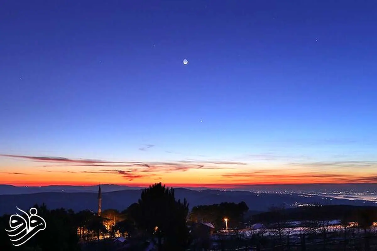 به نقل از ناسا، ماه جوان که سمت تاریک آن به طور ضعیفی با نور زمین روشن شده، در آسمان تقریباً صاف اوایل عصر بر فراز روستای کرازلی ترکیه به سه سیاره درخشان پیوسته است.